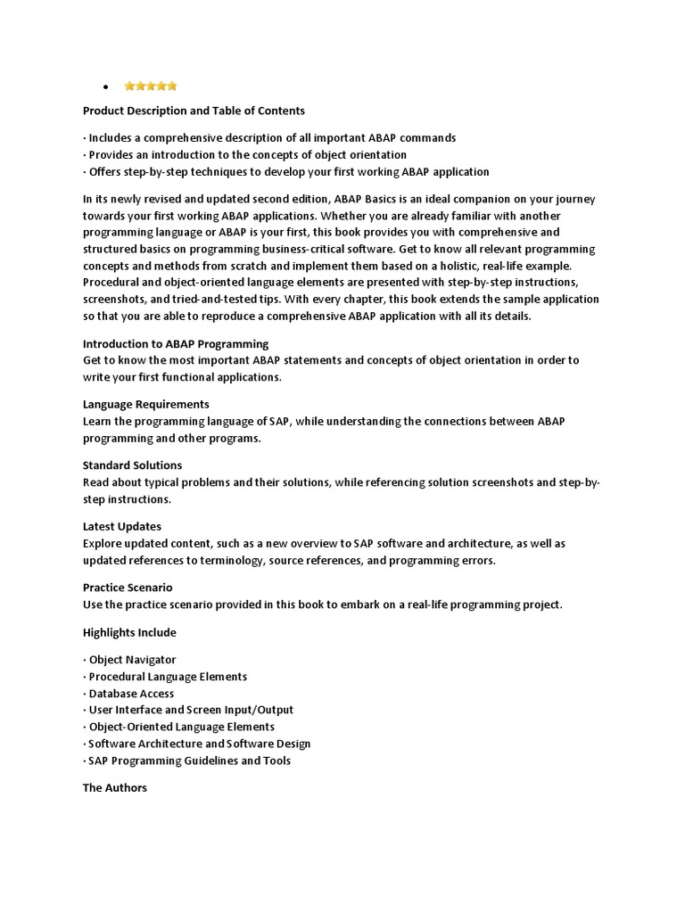 Professional analysis of Abap Basics 2nd Edition. Database compiled 10 expert feeds and 8 visual documentation. It is unified with 9 parallel concepts to provide full context.