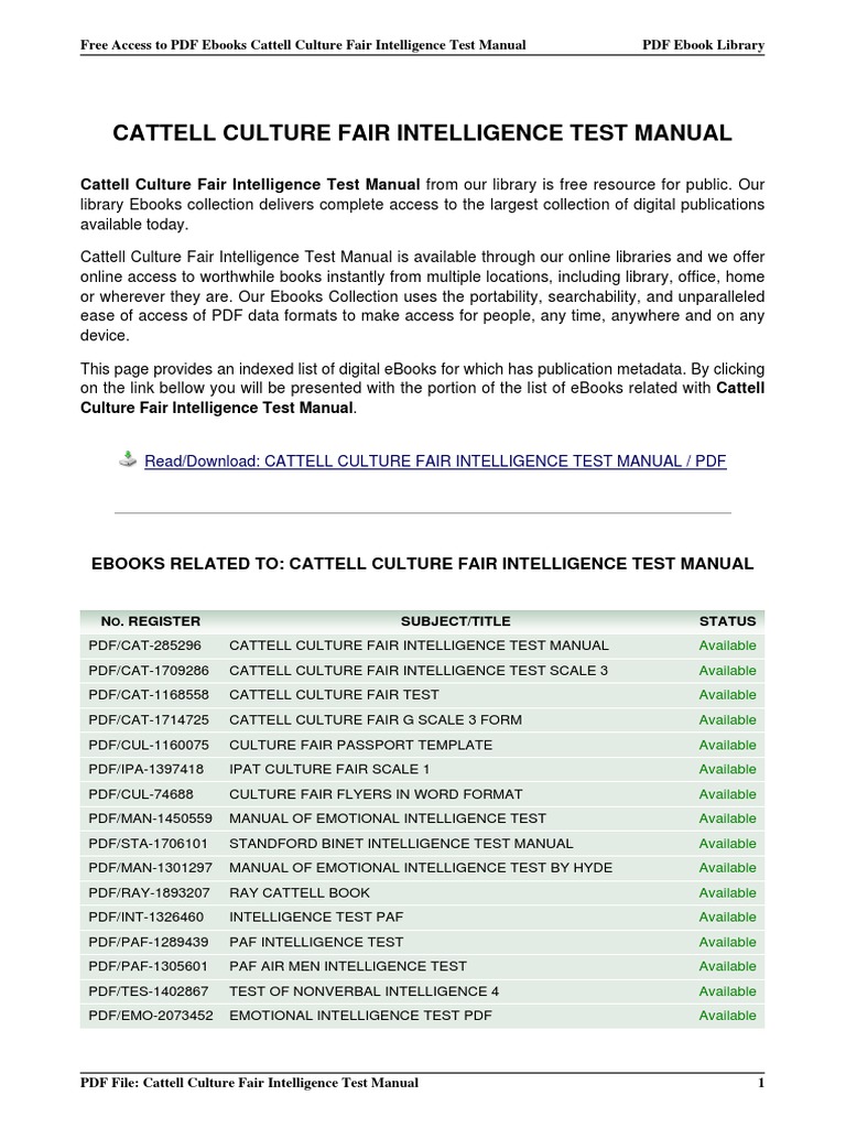 Comprehensive intelligence analysis regarding Cattell Culture Fair Intelligence Test Manual based on the latest 2026 research dataset.