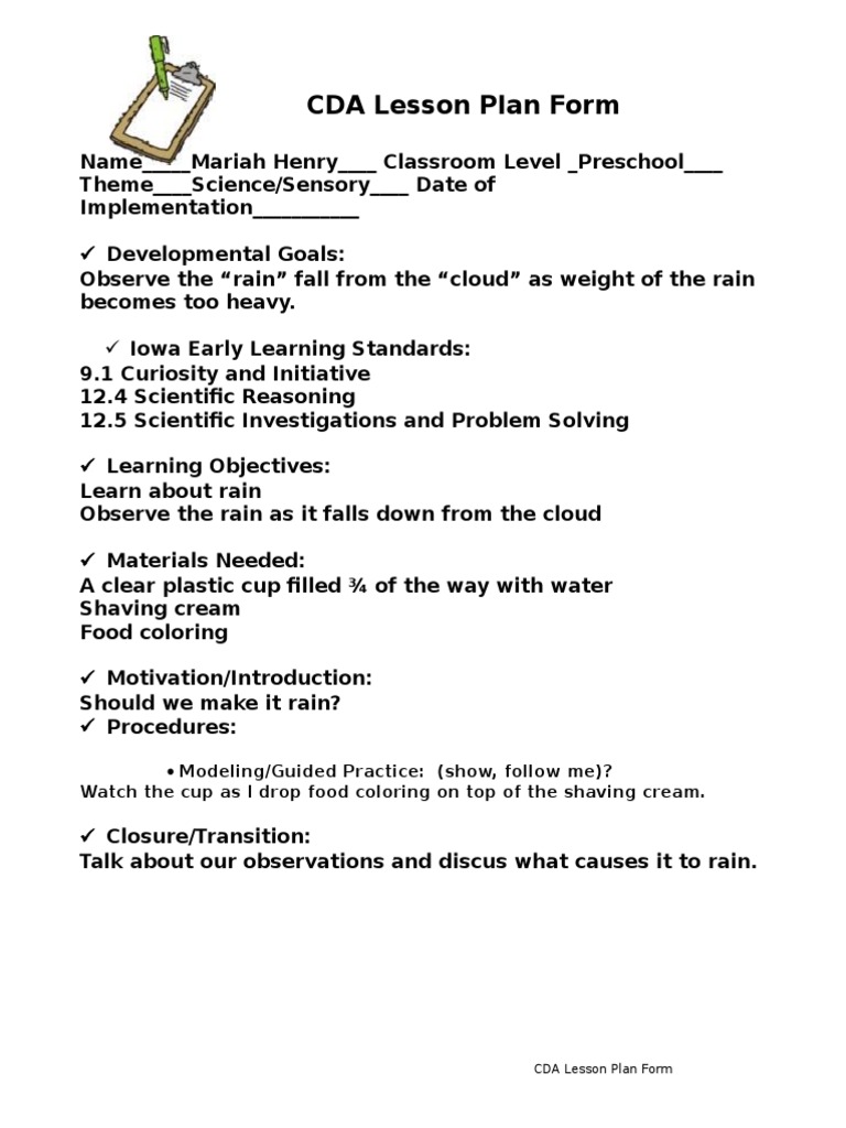 Cda Sample Weekly Lesson Plans For Toddlers