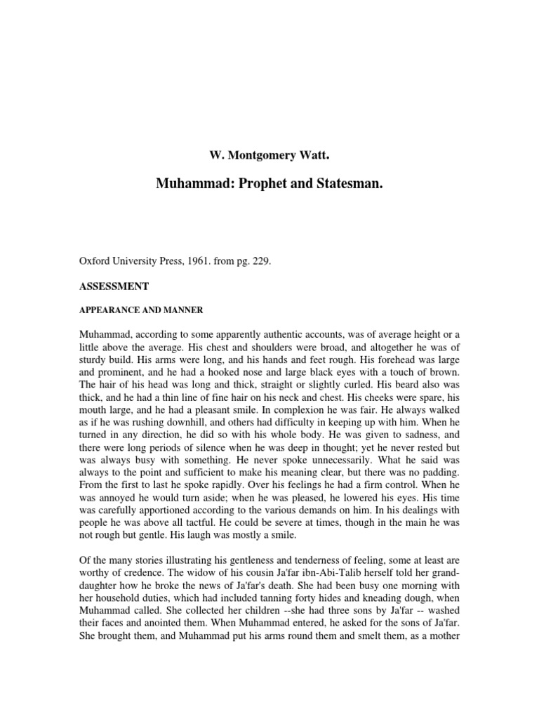 Muhammad Prophet And Statesman Watt Detailed Analysis