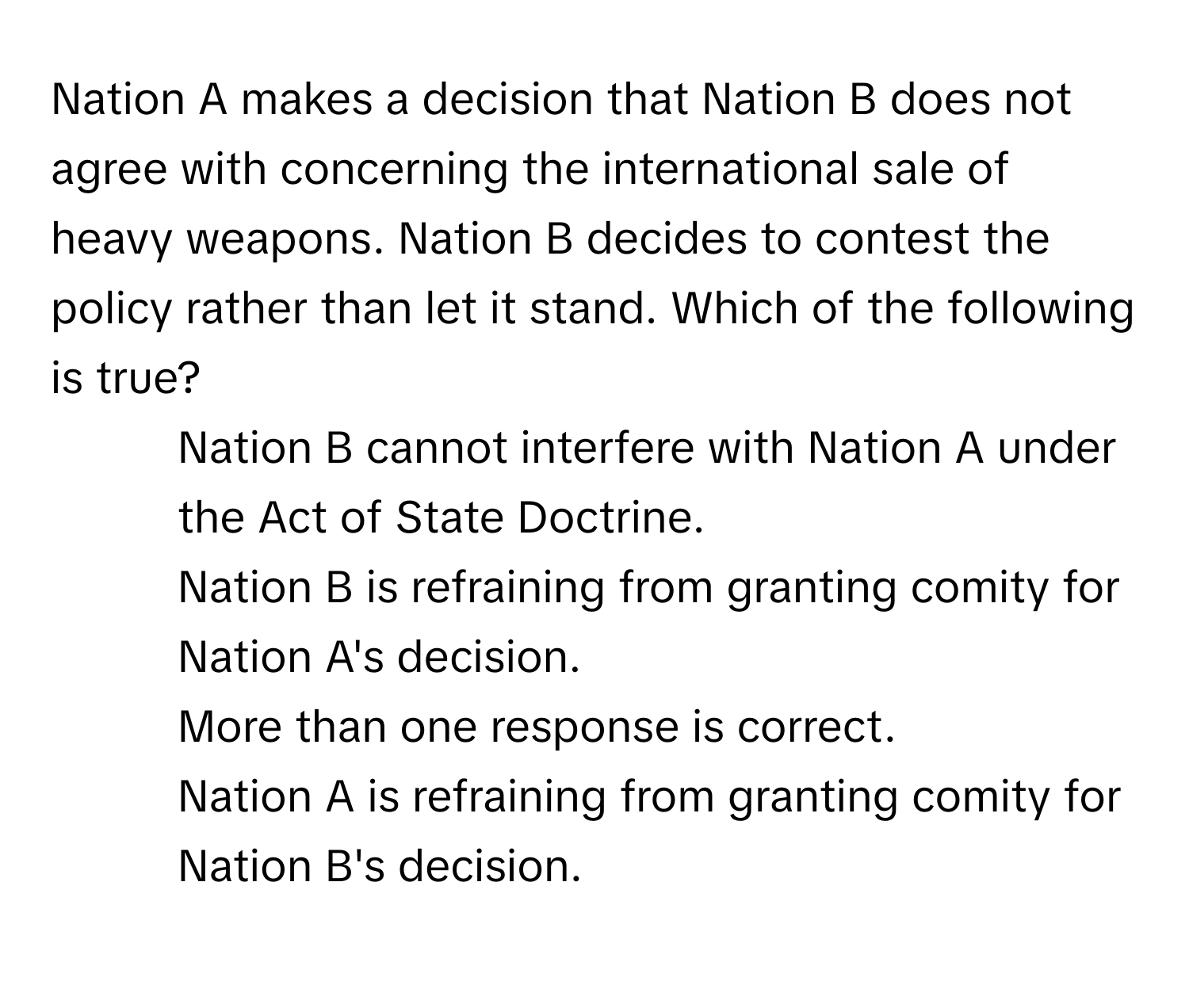 Nation B's decision to contest Nation A's policy on heavy weapons indicates that it is choosing not to grant comity towards that decision. While Nation B cannot interfere with Nation A under the Act of State …