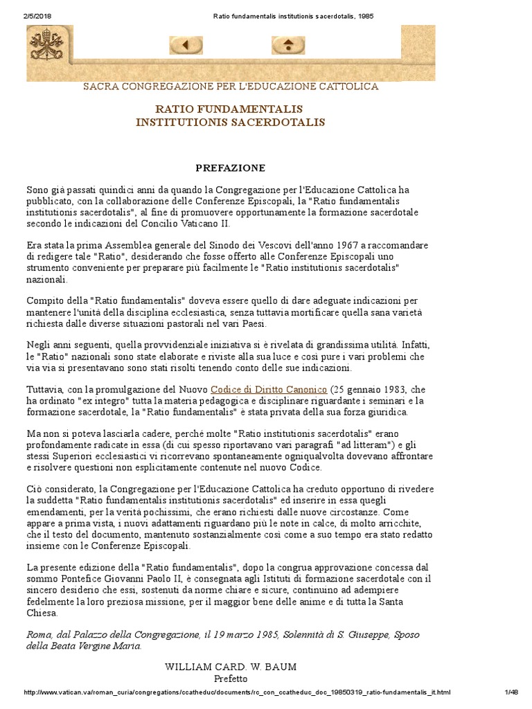 Strategic analysis of Ratio Fundamentalis Institutionis Sacerdotalis 1985 drawing from comprehensive 2026 intelligence feeds.