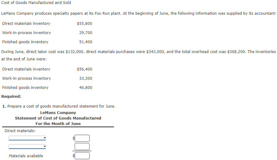About Solved Cost Of Goods Manufactured And Sold Lemans Company