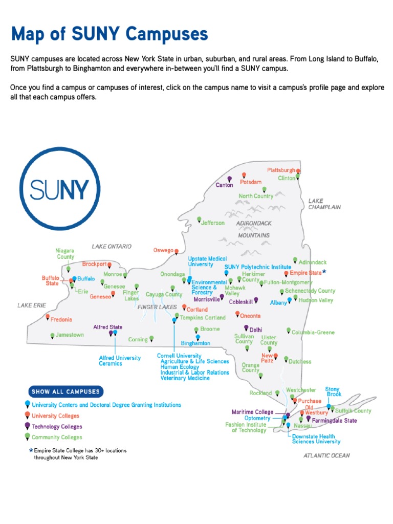 SUNY campuses are located across New York State in urban, suburban, and rural areas. From Long Island to Buffalo, from Plattsburgh to Binghamton and everywhere in-between you'll find …
