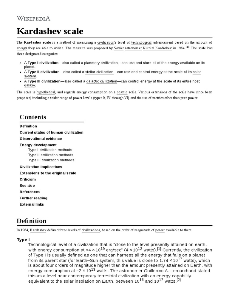 3 days ago · Welcome to the Kardashev Scale Wiki The Kardashev scale is a method of measuring a civilization's level of technological advancement, based on the total energy usage …